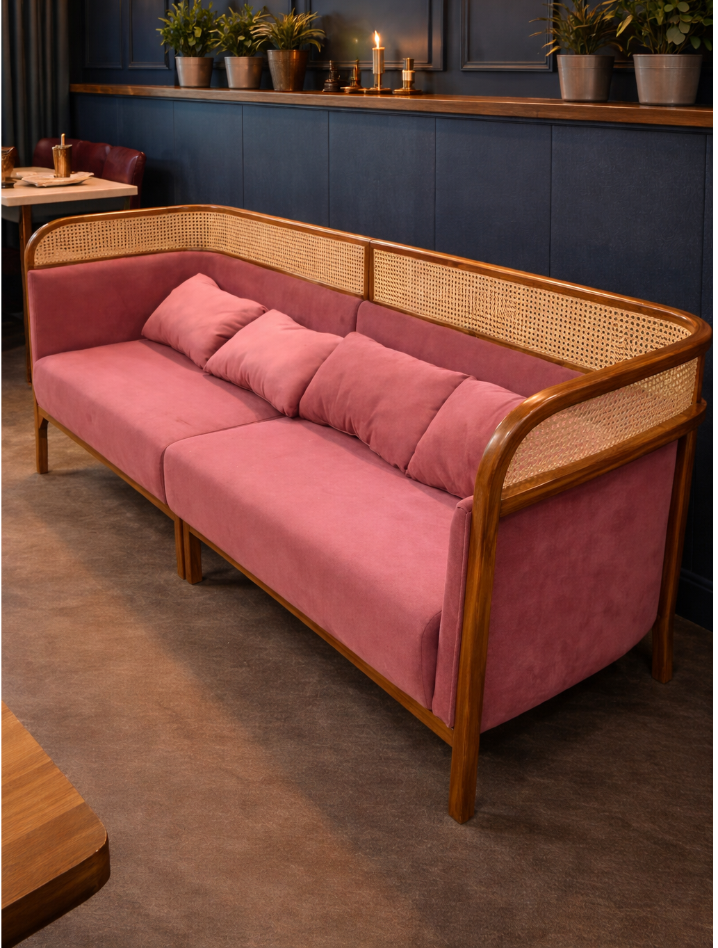 The sofa showcased is crafted from premium teak wood, enhanced with natural cane (rattan) work, giving it a sophisticated and modern look. It features a PU top with Sleepwell seating, offering exceptional comfort along with durability—perfect for high-usage areas like hotels, cafés, and lounges.